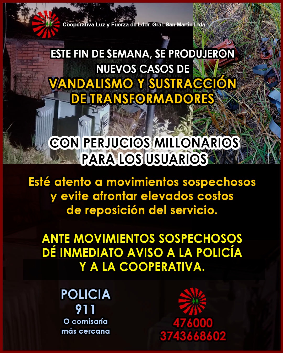 Nuevos hechos de vandalismo y robo de transformadores se registraron durante el fin de semana en las localidades misioneras de Garuhapé y Ruiz de Montoya, generando perjuicios millonarios para los usu