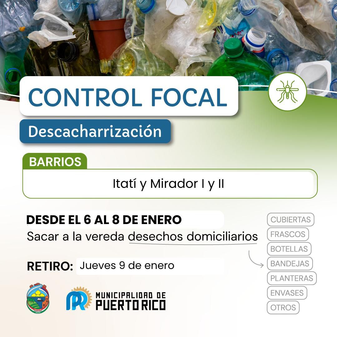 Desde el lunes 6 hasta el miércoles 8 de enero, se realizará un operativo de control focal en los barrios Itatí y Mirador I y II, con el objetivo de prevenir la proliferación del mosquito transmisor d